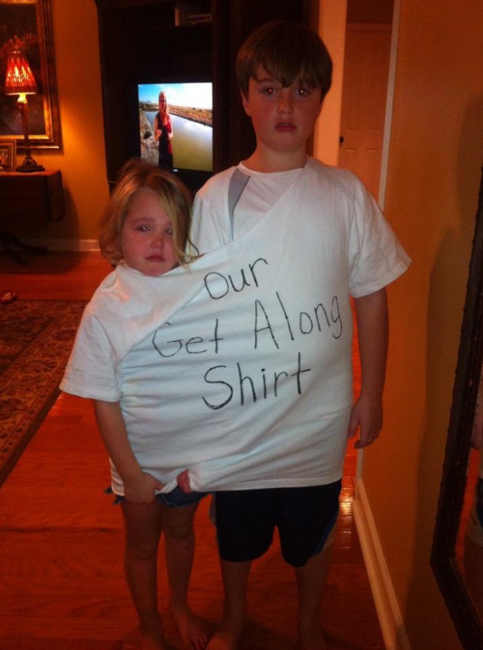 This brother and sister were bad and now they have to wear the "Our Get Along Shirt" which forces them to be together.