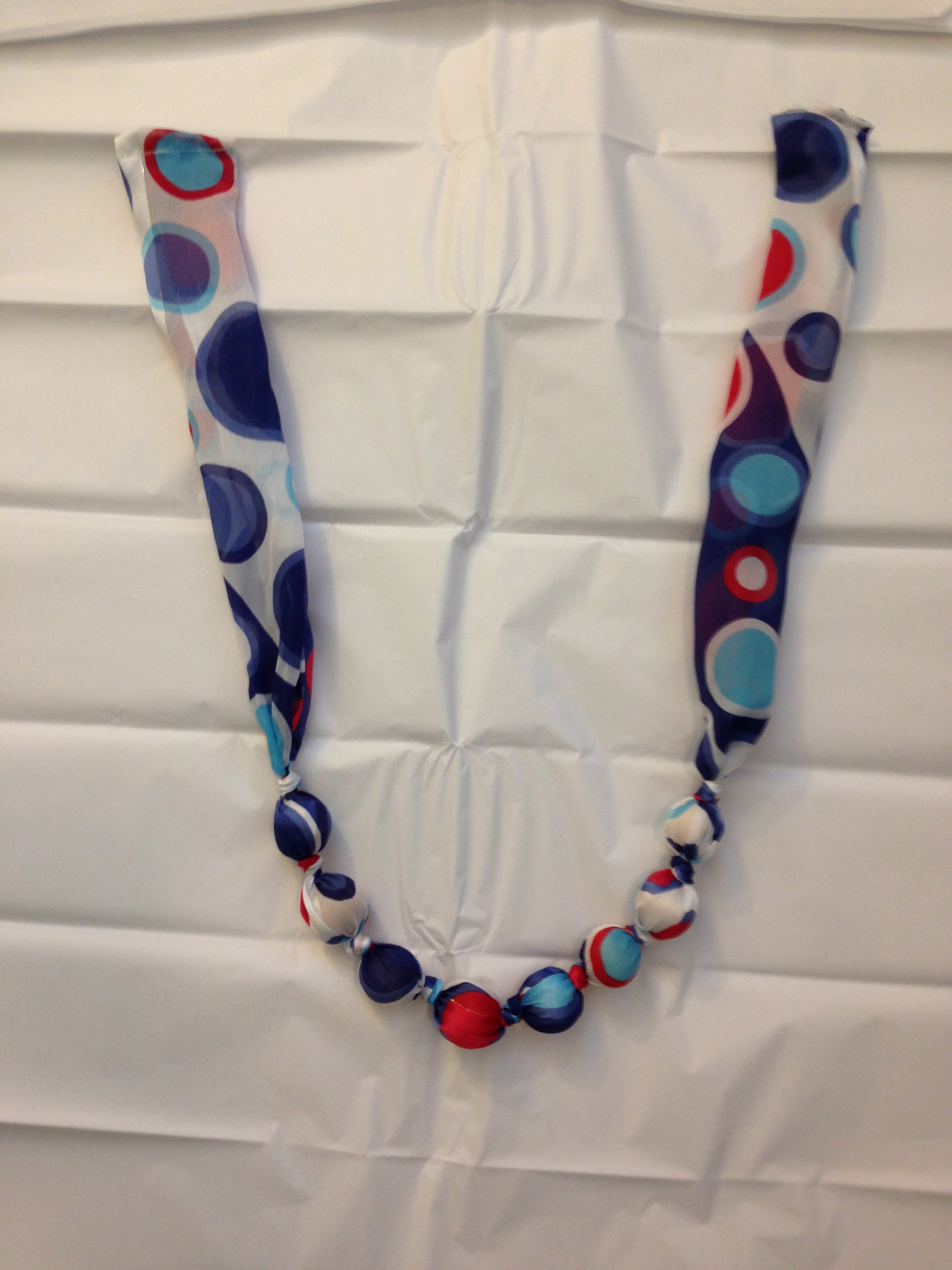 Hold the bead tightly to mark center. Tie a tight knot on each side of center bead. Repeat process until you have about 8 beads inside fabric.