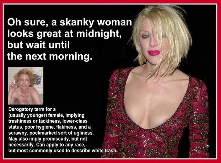 Oh sure, a skanky woman looks great at midnight, but wait until next morning. Derogatory term for a usually younger female implying trashiness or tackiness, lower class status, power hygiene flakiness and a scrawny pockmarked sort of ugliness. May also imply promiscuity, but not necessarily. Can apply to any race most commonly used to describe white trash.