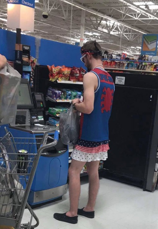 Nothing goes better with a skirt than a Spiderman tank top. This guy knows his fashion.
