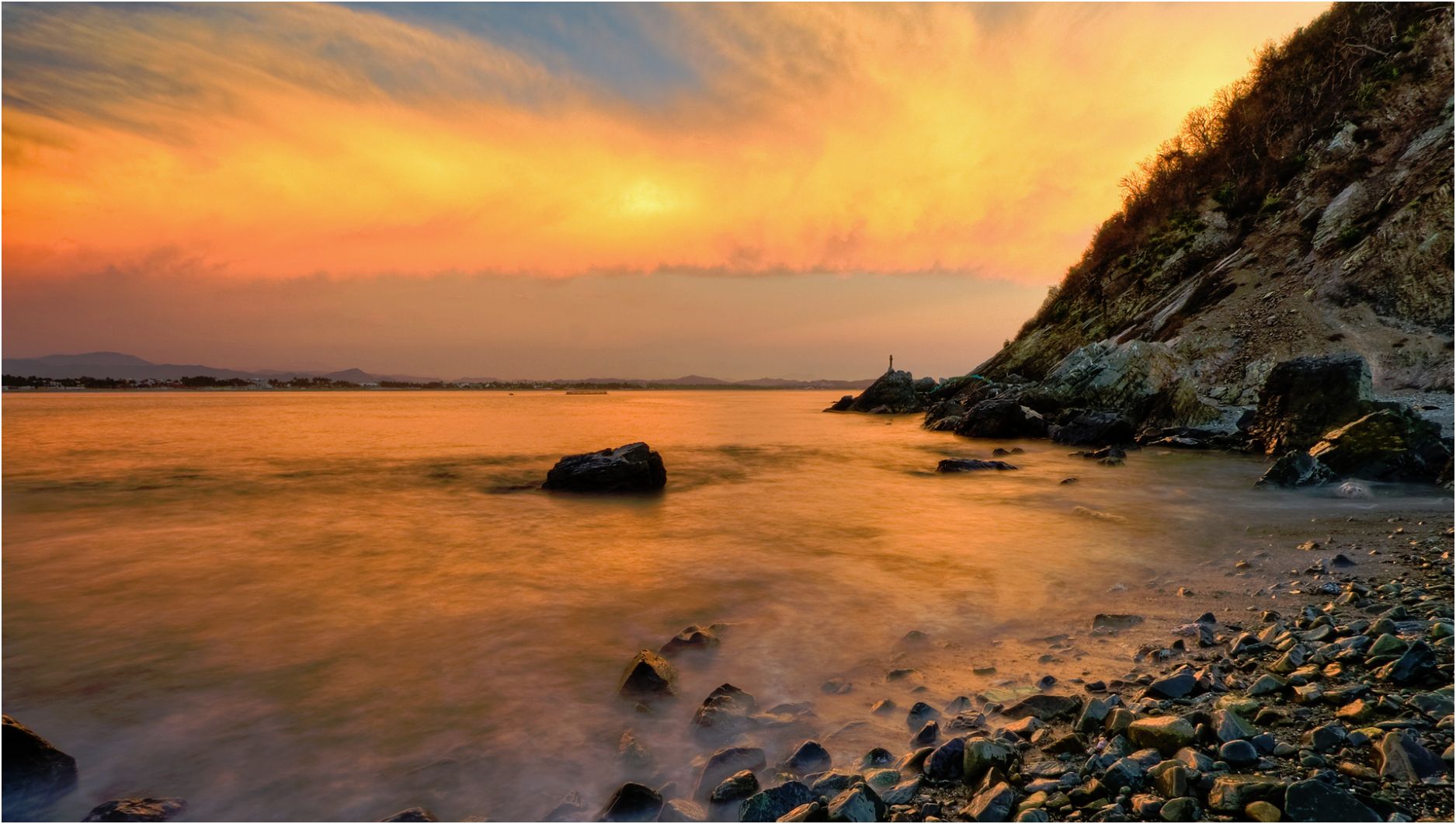 It's sun rise in a mountains the water is cold and the fog is thick the sunlight is trying to heat up the earth with its warm light but to get to the earth it has to heat up the sky first so it looks like the sky is on fire. :)