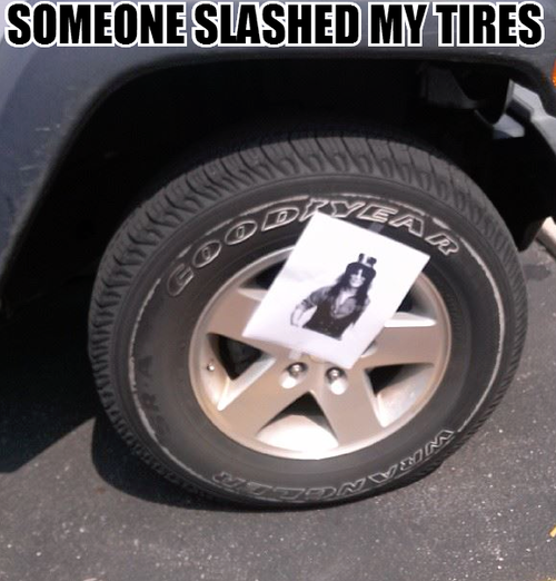 Instead of the usual "slashing" of the tires, they put a picture of slash instead. I wouldn't mind if this happened to me. It's so funny. It would make my day.