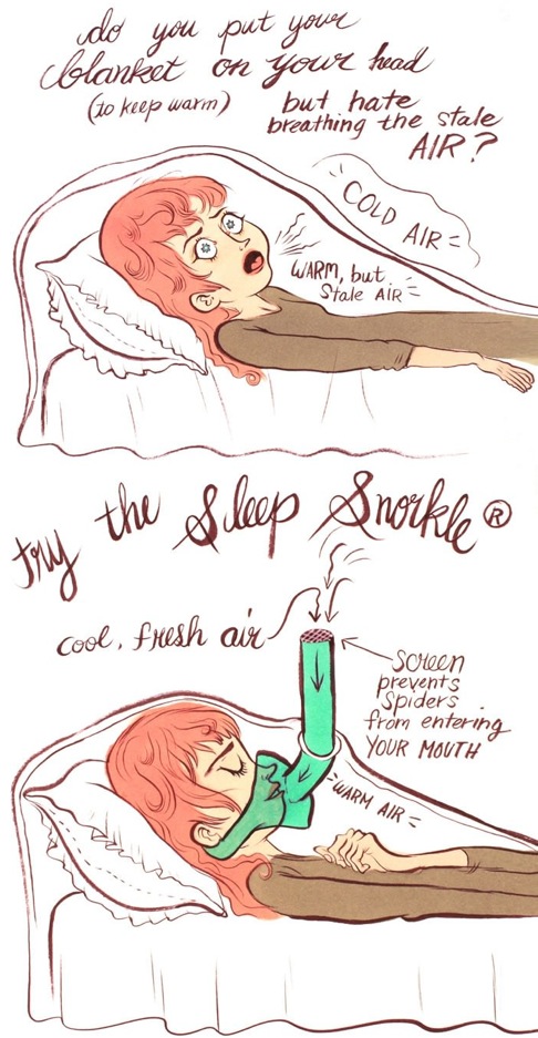 Sleep Snorkle. Do you put your blanket on your head to keep warm but hate breathing stale air? try the sleep snorkle. screen prevents spiders from entering mouth