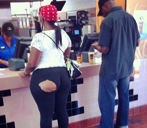 This girl is a real fashionista. She has a slight tear in her sweats that looks like her butt is making a run for it. I guess there was no need for panties either.