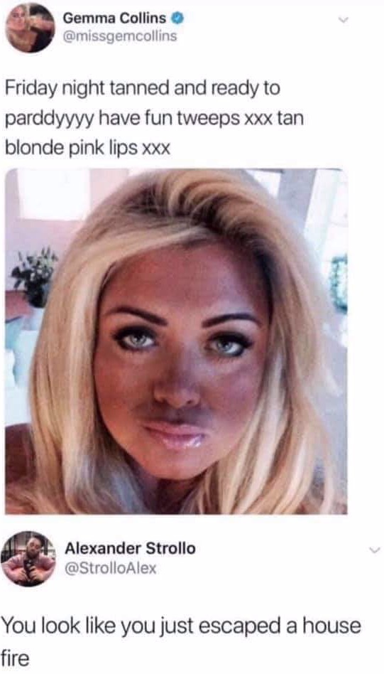 Friday night tanned and ready to party. Have fun people. Tan blonde.... looks like she just escaped a house fire.