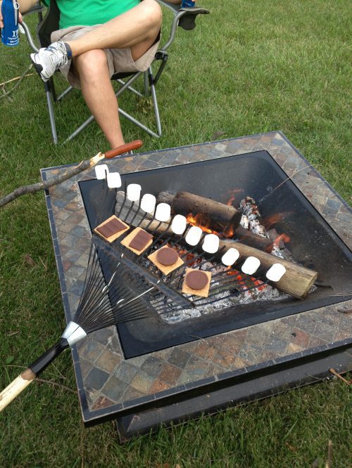 Talk about ingenuity and resourcefulness. These guys used a rake for s'mores mass production. That looks so good!