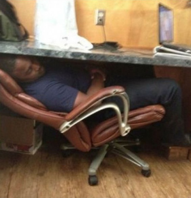 Sneaking in a nap. Maybe nobody will notice that I'm under my desk.