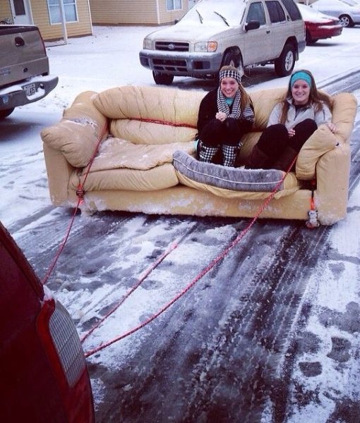 If you are not into all the work required to ski the traditional way why not try snow skiing on a couch? You can get all the benefits of exercising while watching tv and eating popcorn.