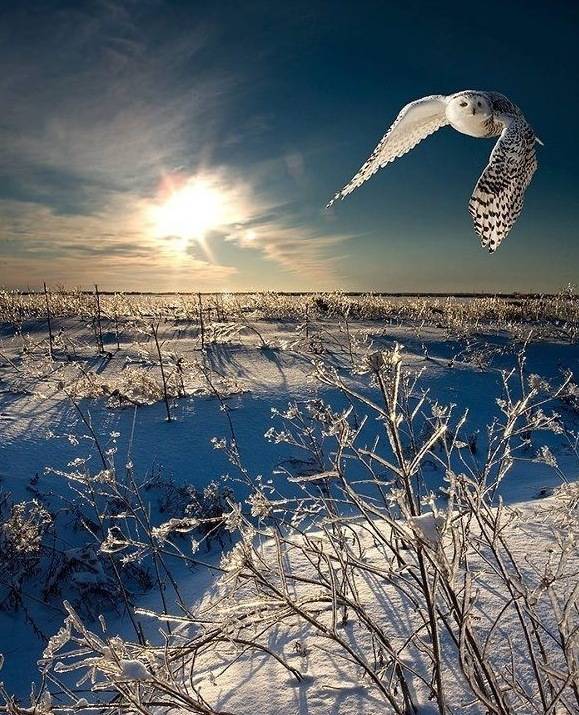 Sunlight breaking through the clouds on this bird in flight over the snow