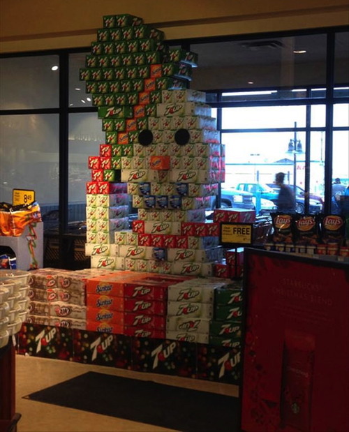 A snowman built entirely out of softdrink cases. What a way to bring holiday cheer to the store!
