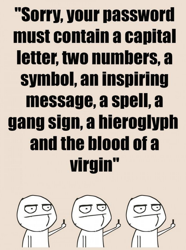 "Sorry, your password must contain a capital letter, two numbers, a symbol, an inspiring massage, a spell, a gang sign, a hieroglyph and the blood of a virgin"