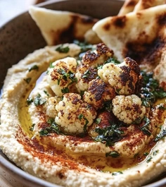 Spicy Roasted Cauliflower with Herb-Infused Oil over Hummus