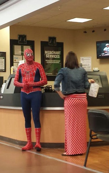 Spidey must have needed a loan at a really low rate and he came to the right place. Walmart now has the best bank because it's guarded by a superhero.