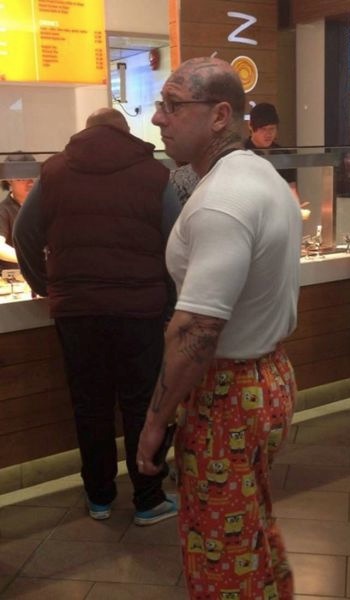 I can't tell whether this guy is a tough guy or a little kid who likes spongebob. I don't think I would mess with him but he does look like a little bit of a wimp below the belt.