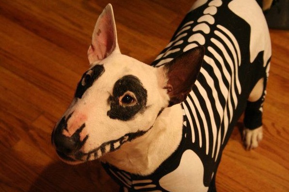 Bull terriers are always the funniest dogs! This dog is dressed for Halloween and already to go trick or treating