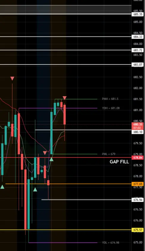 SHORTS: Aiming to defend the PMH 681.5 in order to push below the PML 679. Below this they target GAP FILL 678.84->PD ORB L 677.65->676.94->675.57->PDL 674.98