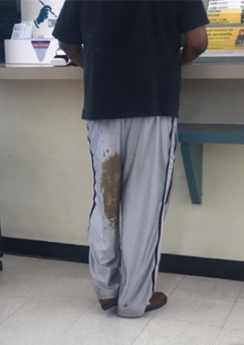 Dropped a bomb in the store. He's probably buying some detergent to go. These are obviously not stain resistant.
