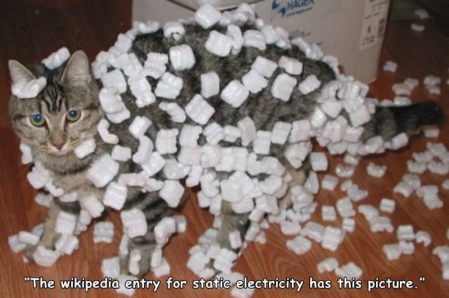 This cat has every styrofoam packing peanut stuck to his body and they are not going to fall off anytime soon.
