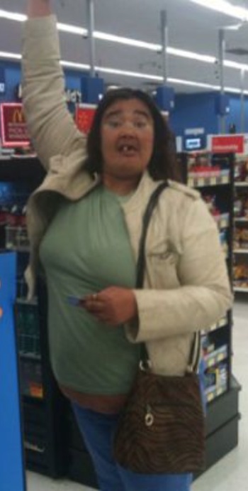 This woman really does look like the statue of liberty only a little bit shorter and less better looking. Walmart is definitely a welcoming ground for misfits.