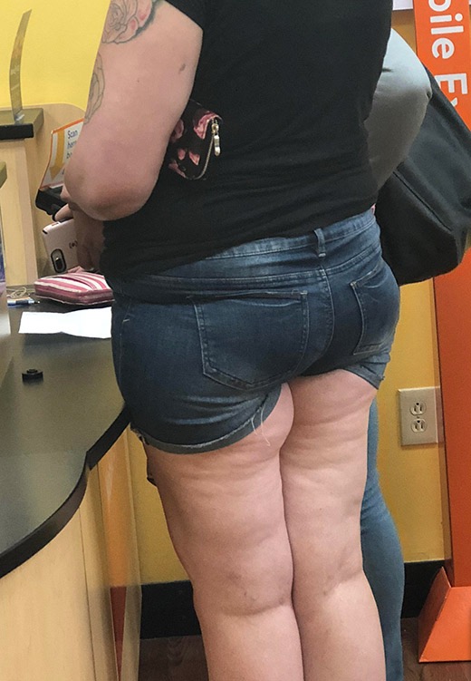 Looks like these sticky shorts are stuck. She's going to need some butter to pry them loose.