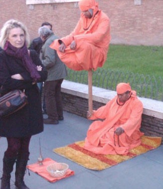 This is definitely an amazing street performance. You know this can't be too easy to sit there so long with a pole up your butt. The carrying part is easy.
