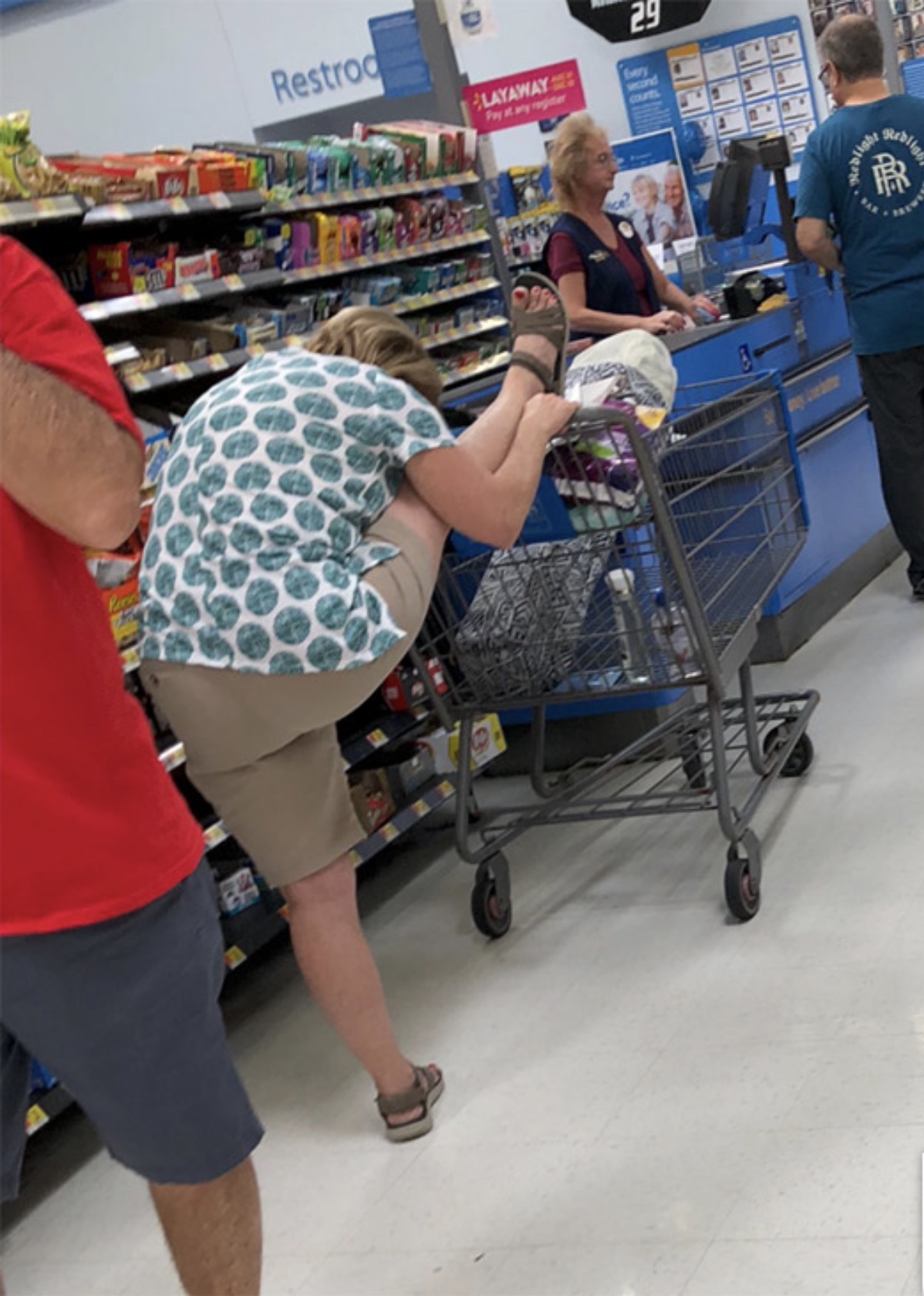 Put on your stretch pants at Walmart and start stretching even in the middle of the line.