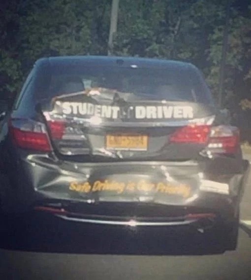 I think he needs to go back to school and study a little more and retake his Driver's Ed classes. It seems like he might have missed a few things. Safe driving is our number one priority? Ha!