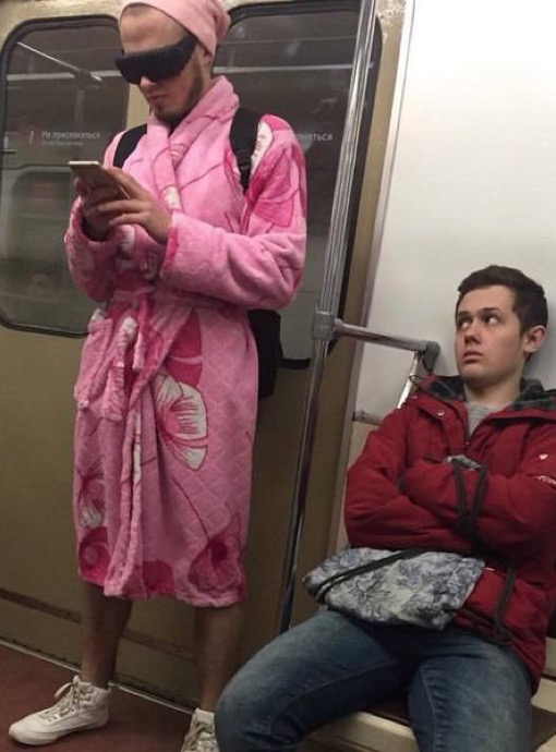This guy is really exhibiting some subway chic. He's got his pink bath robe on and some sunglasses. He's going to go far in life.