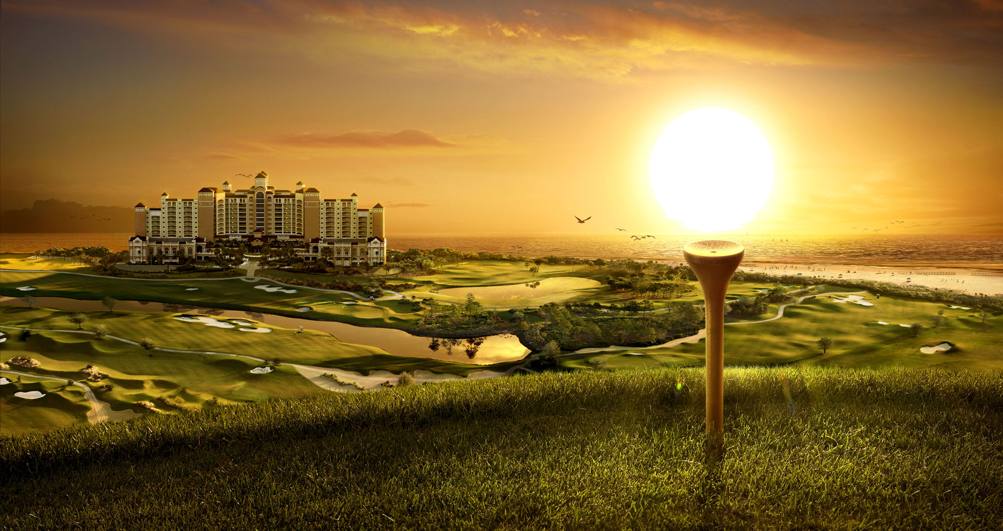 This picture is just beautiful, you have this amazing 5 star hotel in the back with a full scale golf coarse in its backyard, and this awesome sunset just makes everything so much better.