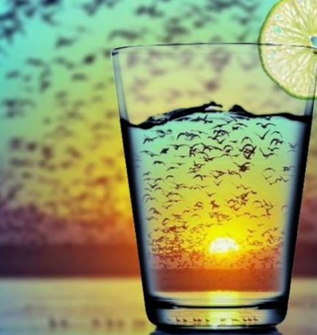 Sunset refraction with lots of birds flying from sunset over the beautiful ocean.