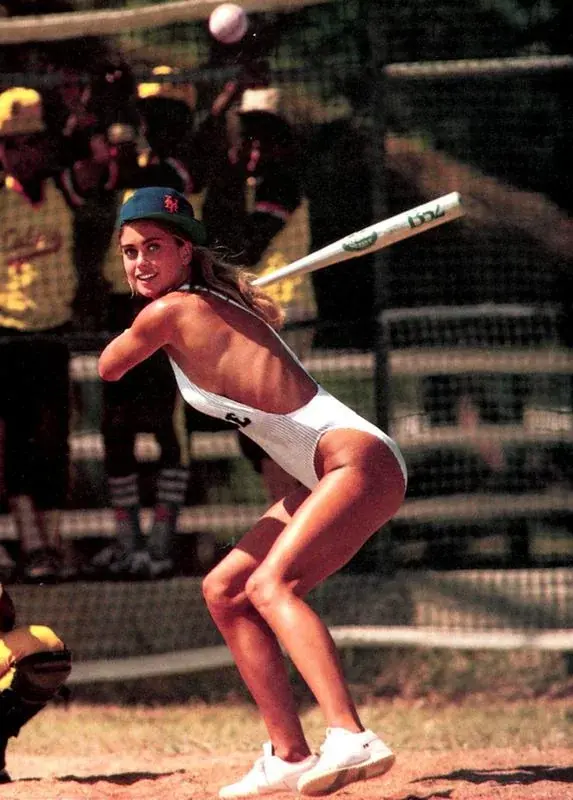 Supermodel Kathy Ireland in a Mets cap, taking her turn at bat in 1987.