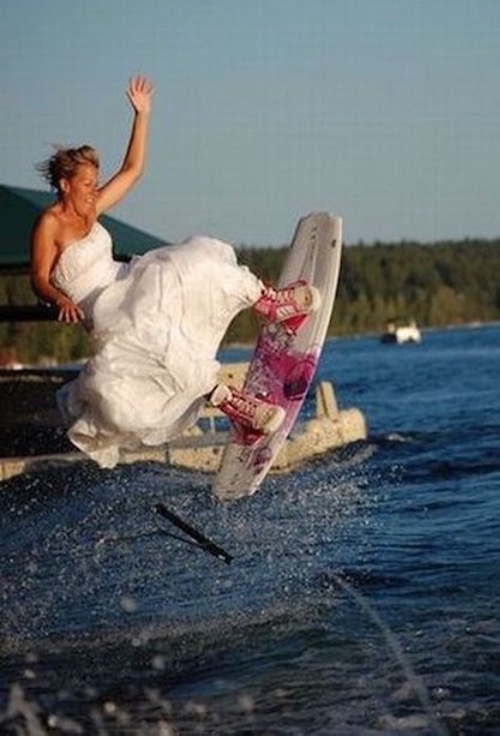 This bride really knows how to surf doesn't she? I'm sure the groom is the one driving the boat. Looks like a shotgun wedding to me.