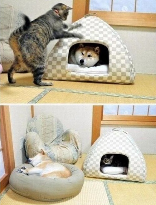 Out in nature it's survival of the fittest. Here we see a cat staking claim to a dog's comfortable sleeping spot a nice soft pet igloo. The cat wins and the dog has to sleep outside the igloo in a pet bed. I guess cat claws win.