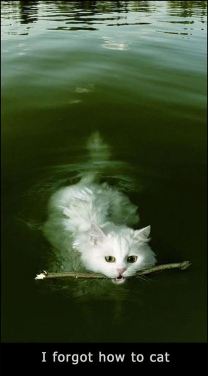 It's understandable with as many as 9 lives this beautiful white cat forgot how to cat. Kitties are not supposed to like the water and fetch sticks!