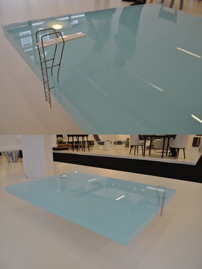 This table has a diving board and is made of transparent glass that appears to be swimming pool water. Very cool and unique table.