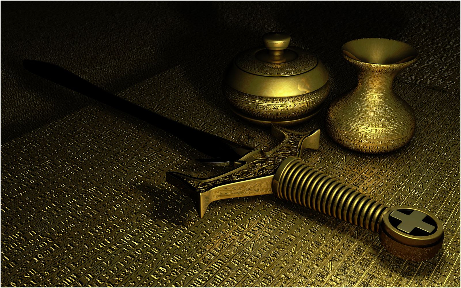 the sword of egypt lays on the slayet of hieroglyphics with two egyptians vases by it