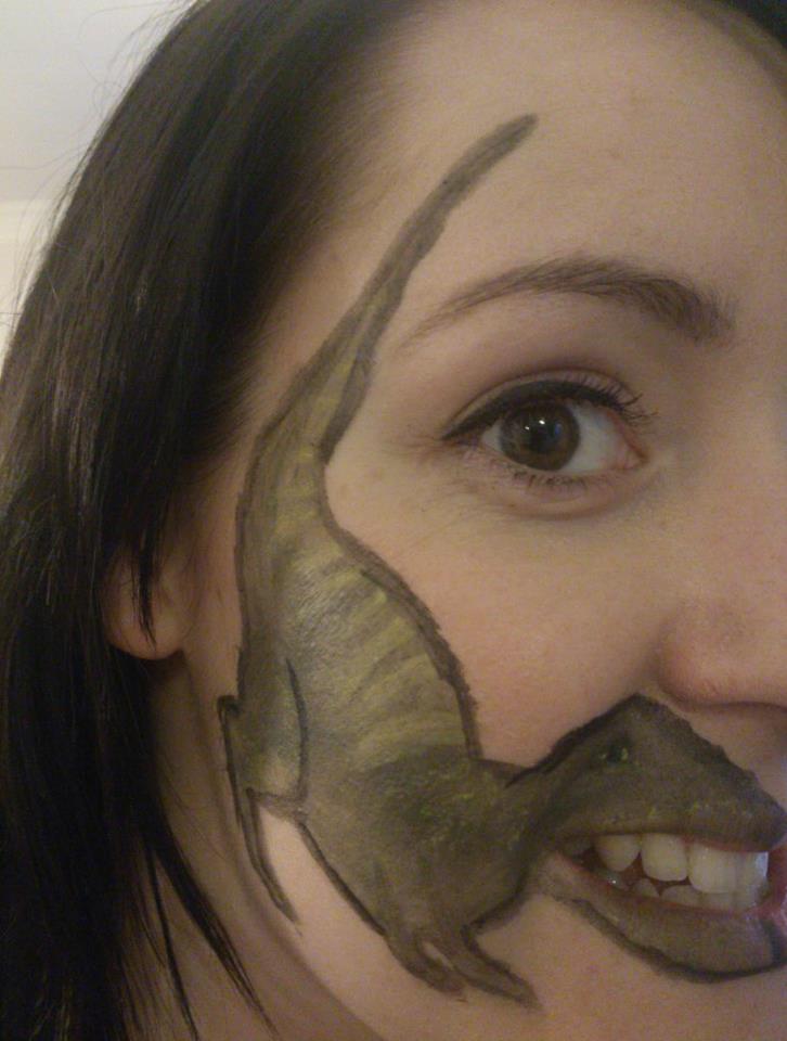 How is this for a dinosaur tattoo? This girl must really love reptiles because she has one on the right side of her face! Her teeth look great on the tyrannosaurus rex!