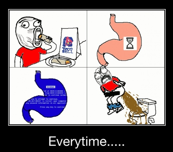 Everytime I eat at Taco Bell my stomach will process the food that it will recheck and then the unexplainable will happen.