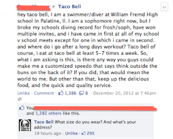 Taco Bell Gets VERY Social With A Customer on Facebook. Free advertising on the high school swimmer's butt. No matter what it costs to make that suit, the return in free publicity will be incredible. What do think? Good idea? I think it's pretty damned smart!