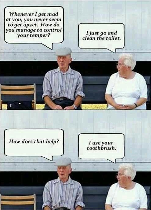 Whenever I get mad at you, you never seem to get upset. how do you manage to control your temper??? I just go and clean the toilet. How does that help???? I use your toothbrush.