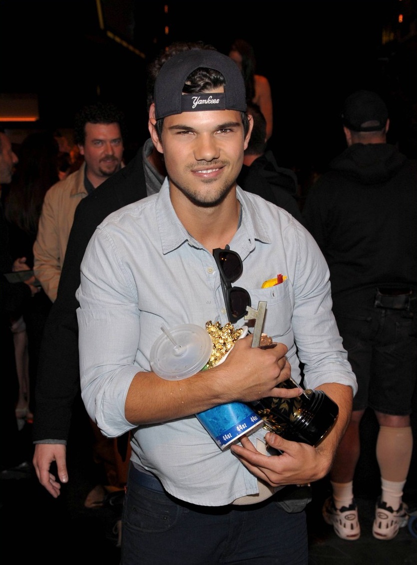 Taylor Lautner took home the prize for Best Shirtless Performance – and sported a big food belly doing it! Taylor was seen dropping his movie candy and popcorn all over the stage.