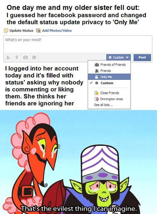 Two sisters had a terrible fight and in order to get back at the other one of the sister hacked up the sister's Facebook account. Now we all know how important a Facebook account is right? And you wouldn't believe what she did later. She changed the preferences to "ME ONLY". I can only imagine the torture she went through when she shared lots of stuff on her wall but she never got a like or a comment or even a share. Awwwwwwwwww!!!!!!!!!! The funny part, the sister still hasn't figured it out.