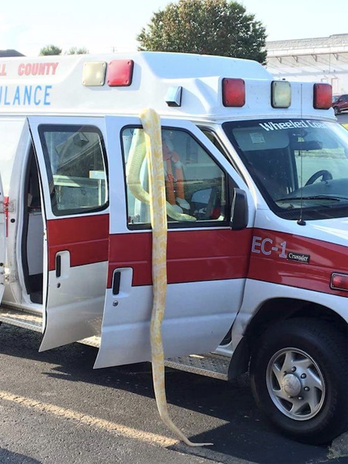 I don't know about you but if this ambulance showed up I might have a heart attack. That snake looks like it's ready to swallow me whole.