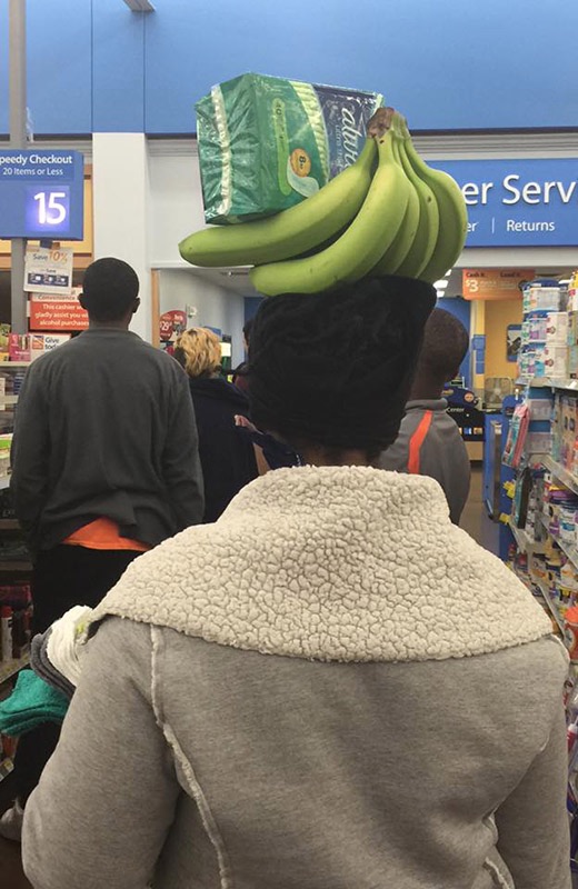 Who needs one of those big bulky carts when you can just throw your groceries on top of your head? It has the duel benefit of also creating good posture.