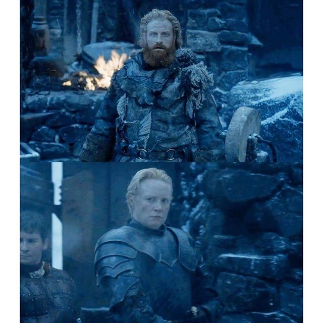 The opening scene showed us Brienne arriving along with Sansa and Podrick at Castle Black. Now this when Sansa saw Jon and they had a very teary reunion, but this was also when we saw a somewhat shocked (love at first sight?) Tormund looking mesmerized at Brienne. Later on when they were eating together, Tormund continued his love-dovey gaze much to Brienne's discomfort. Is this how wildlings show their interest?