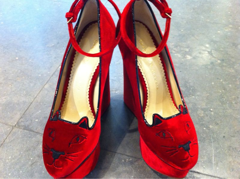 Every lady should have a pair of these velvety kitties. Red velvet high heeled wedges adorned with a cute kitty face on the top of each shoe. They are not only beautiful but they will make the wearer smile and even giggle each time she glances at her feet. MEOW !