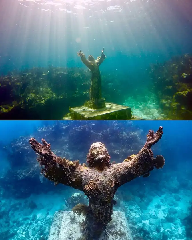 The 'Christ of the Abyss' statue is a 9-foot-tall bronze statue of Jesus underwater in Key Largo, Florida.