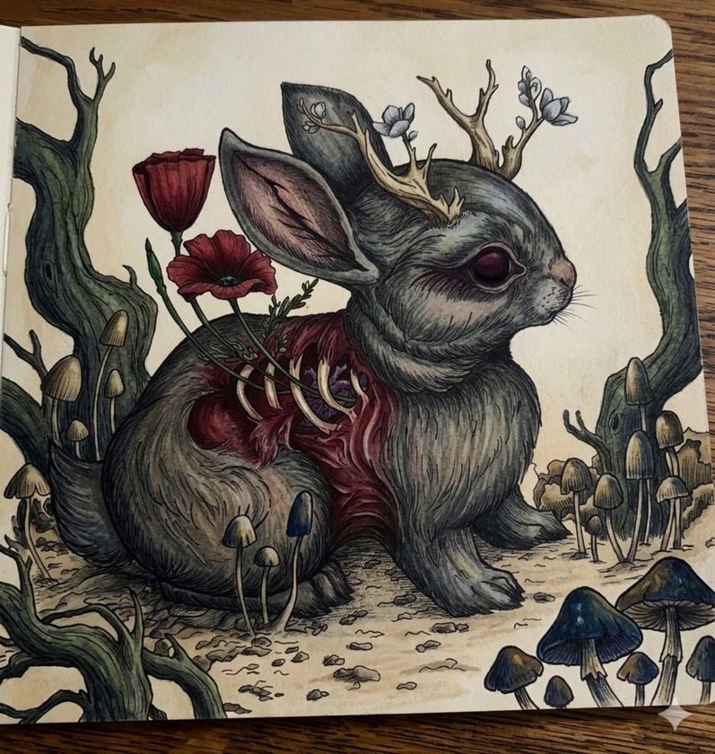 In a muted, fungal wasteland, a jackalope-like creature has become a living vessel for a relentless floral parasite. Vibrant red poppies don't just grow beside it—they erupt directly from its chest, weaving through a hollowed-out ribcage and replacing vital organs with tangled stems. This bunny is no longer a resident of the woods; it has become the woods.