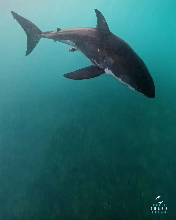 "The great white shark turns downward into the mysterious green waters."💚🌻