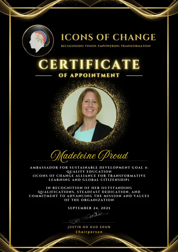 The Icons of Change Global Secretariat proudly announces the appointment of Madeleine Proud as Ambassador for Sustainable Development Goal 4 Quality Education, under the Icons of Change Alliance for Transformative Learning and Global Citizenship.